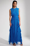 De Eileen geplooide maxi-jurk met ronde hals en ruches straalt tijdloze elegantie uit met zijn geplooide ontwerp en ruches. De ronde halslijn en de vloeiende maxi-lengte creëren een sierlijk silhouet, terwijl de zachte, geplooide stof een vleugje textuur en verfijning toevoegt.