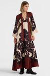 Deze prachtige satijnen jurk heeft een boeiende grenadilleprint, geaccentueerd door de opstaande kraag en elegante watervalmouwen. De vleugel aan de achterkant en de maximale lengte geven hem een tijdloze charme, waardoor hij een perfecte keuze is voor het feestseizoen.